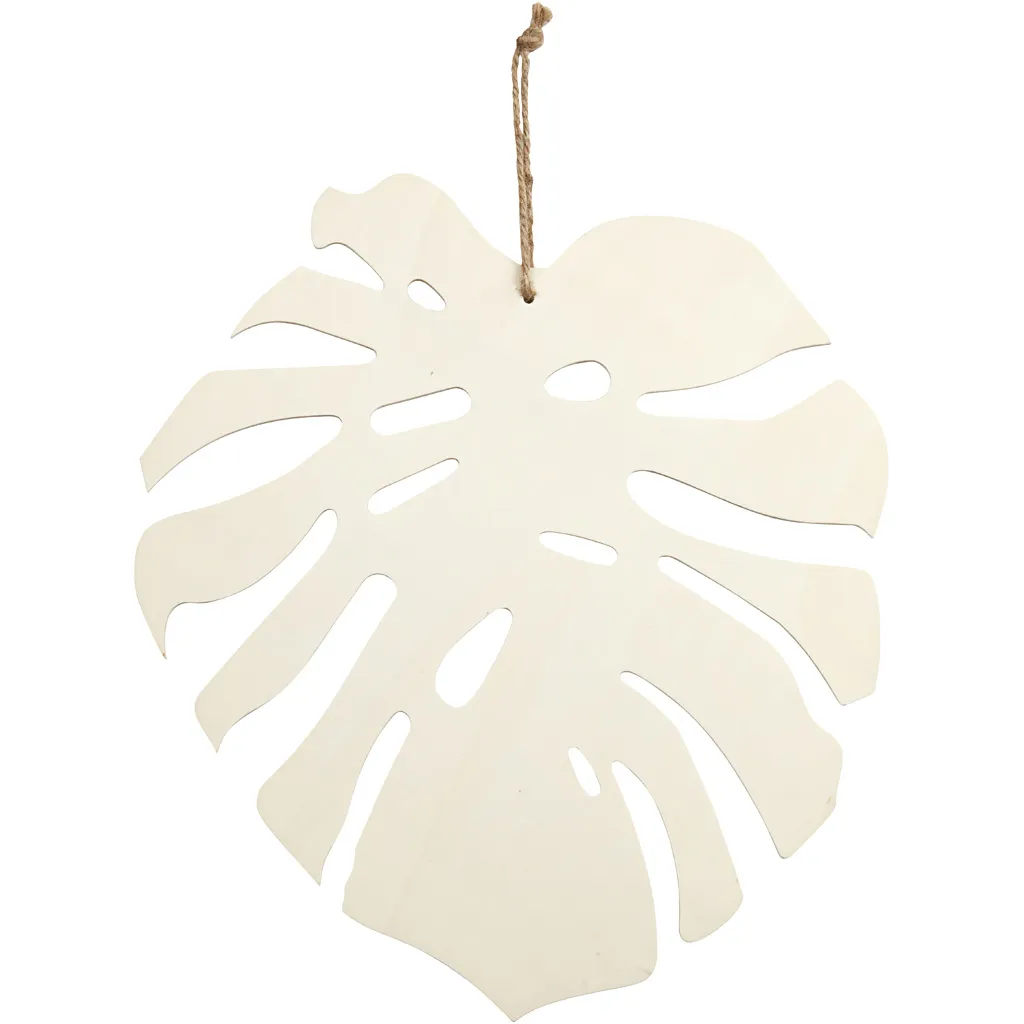 Monstera utskuren av ljust trä med upphängningssnöre av lin