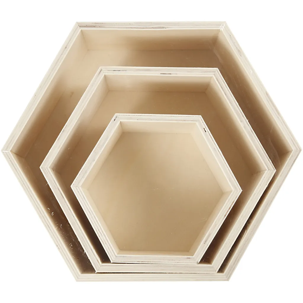 1 Set, 3 St., Sexkantiga, H: 14,8+19+24,2 cm, D: 10 cm, Plywood