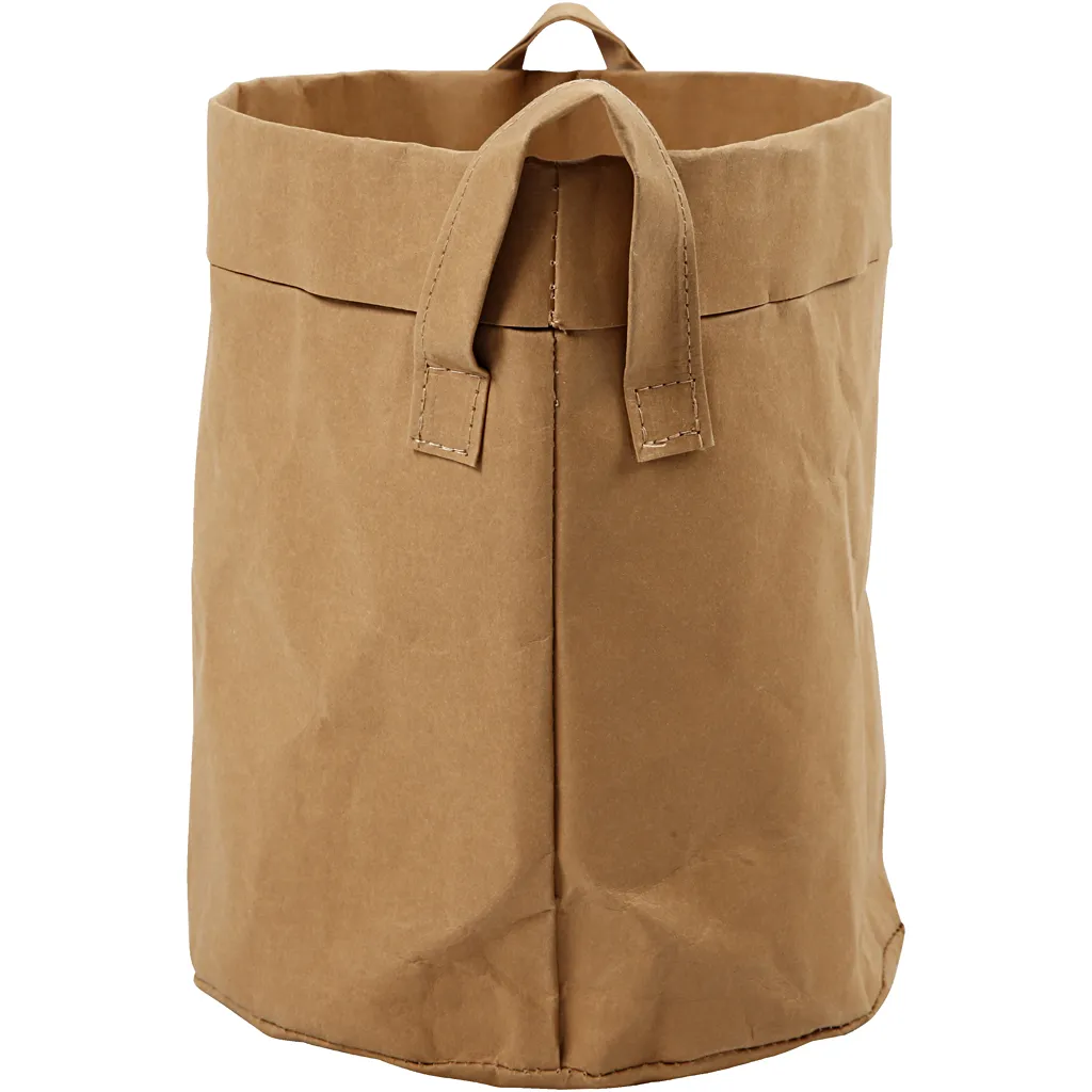 Figursydd, rund påse av kraftigt läderpapper med handtag. Läderpapper (0,55 mm) är tillverkad av cellulosa och latex, ser ut som läder och och är perfekt att sy i, eller dekorera. Uttrycket blir extra rustikt vid tvätt. Tvättas i max 40 °C, krymper ca. 5%. Enklast att abeta med i fuktigt tillstånd.