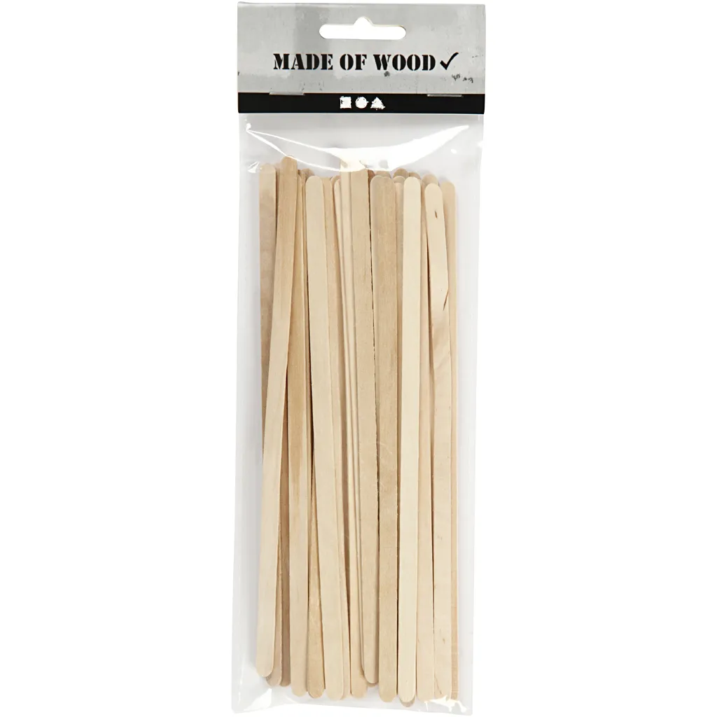Platta träpinnar i ljust trä som du kan kombinera med träpinnar i andra storlekar och limma ihop för massor av kreativa hobbyprojekt.Använd glasspinnarna som de är eller korta av dem med en kraftfull sax. Du kan täcka dem med självhärdande modellera som lätt fäster på det absorberande träet. För färgläggning kan du använda tuschpennor, färgpennor och kritor och för limning kan du använda hobbylim, limpistol eller Klar Multilim Gel..Våra glasspinnar i trä används framförallt för konstruktioner och modellbyggen! Och precis som träpinnar och tändstickor är de mycket populära i hobbyvärlden tack vare sin stora kreativa potential. Både vuxna och barn kan ha roligt i timmar med att bygga roliga saker av glasspinnar. Med lite fantasi kan de kombineras till broar, möbler och hus – det här är små, kreativa projekt som kräver både eftertanke och koncentration. Men glasspinnar kan, som namnet antyder, också förvandlas färgglada isglassar som de små kan använda i sitt leksakskök. De platta träpinnarna har många användningsområden, vilket gör dem bra att ha på lager när kreativiteten och skaparlusten infinner sig.