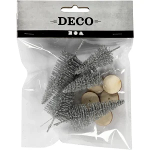 Små granar av tätt satta nylonstrån på virad ståltråd. Varje gran kan sättas på den lilla träfoten som följer med till varje. Används t.ex. till mindre jullandskap