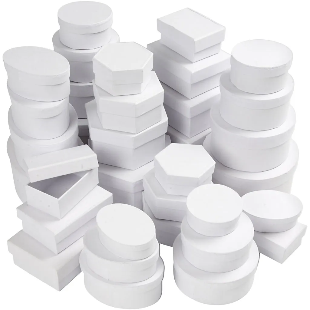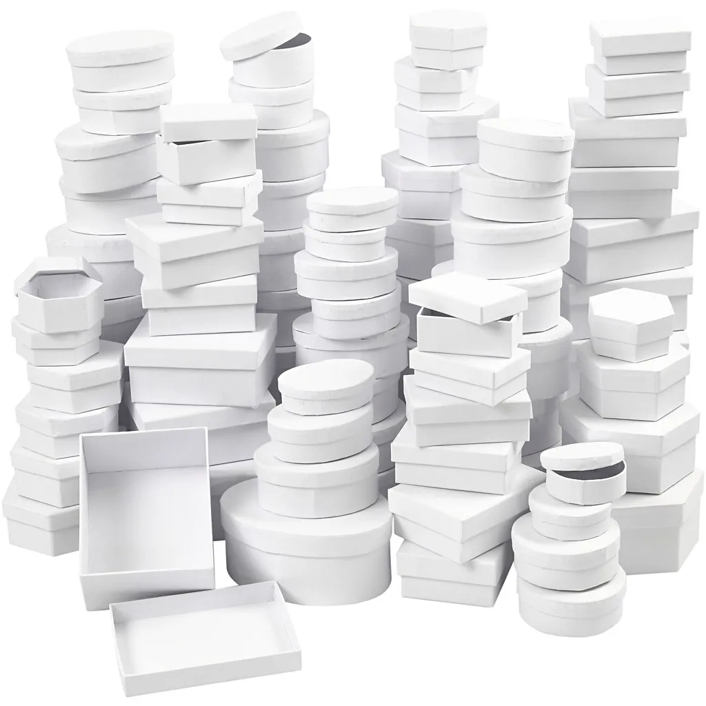 Sortiment med askar av papp i olika former och storlekar
