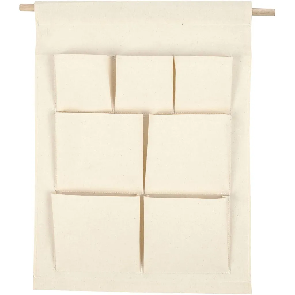 Praktisk organizer med fickor i kraftig kanvas med plastbelagd baksida för bättre stabilitet. Löpgången upptill är perfekt för en rundstav av trä att hänga upp i. Perfekt till förvaring av många olika småsaker, till paketkalender och liknande. Kan dekoreras med textiltusch, textilfärg och liknande..Dekoreras med textiltusch, textilfärg, stämplar, filt, tyg, rub-on motiv, stryktyg och mycket mer. Stryk på framsidan då baksidan är belagd med plast..Används som personlig paketkalender eller som förvaring av kontorsartiklar, verktyg, leksaker och mycket mer.7 fickor - stl. 9x9,3 cm + 12,5x14 cm