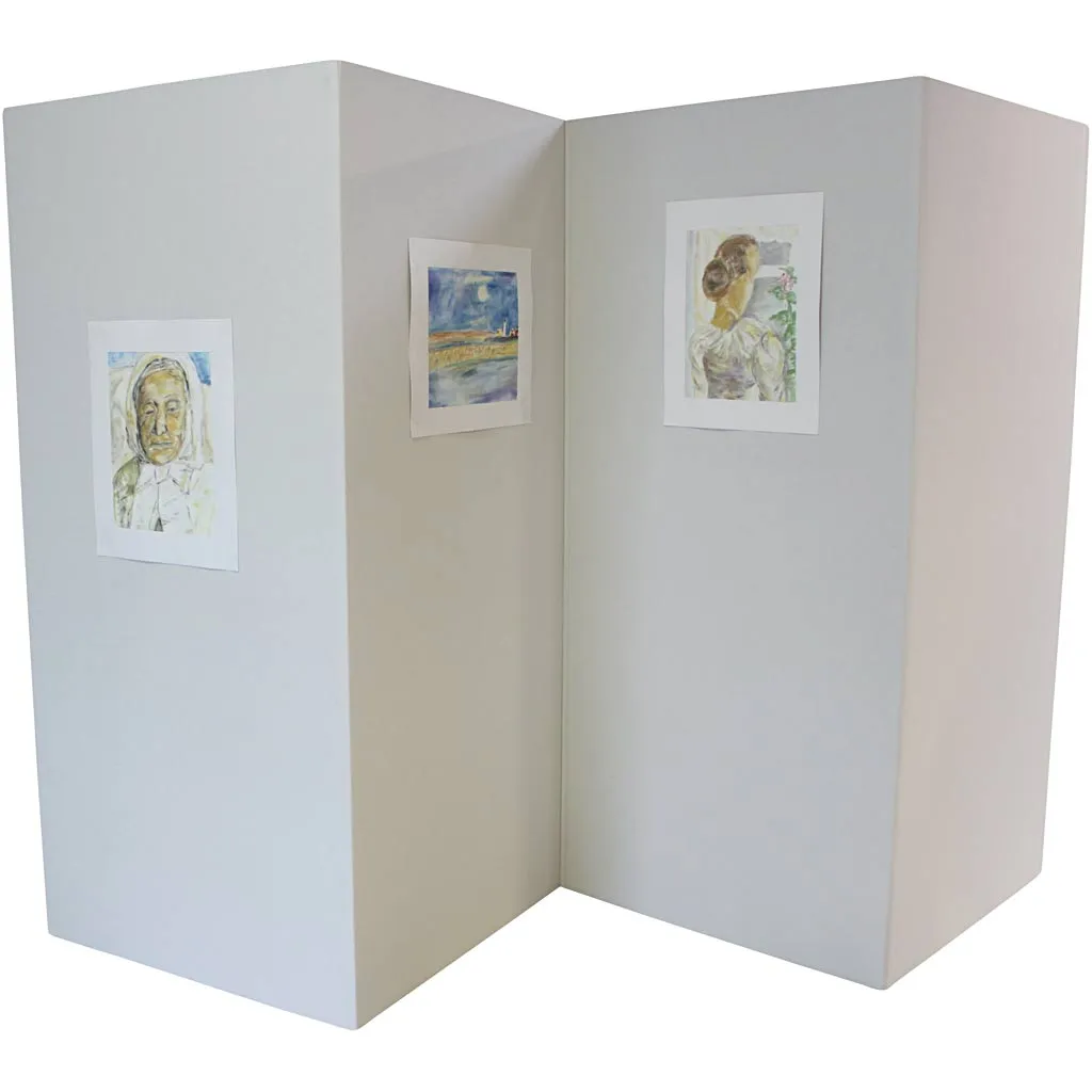 Varje skärm består av 4 sektioner som var och en är 90 cm bred. Stl. 190 x 360 cm. Tjocklek 4 mm. Utställningsyta: 10,8 x 1,9 m på varje sida