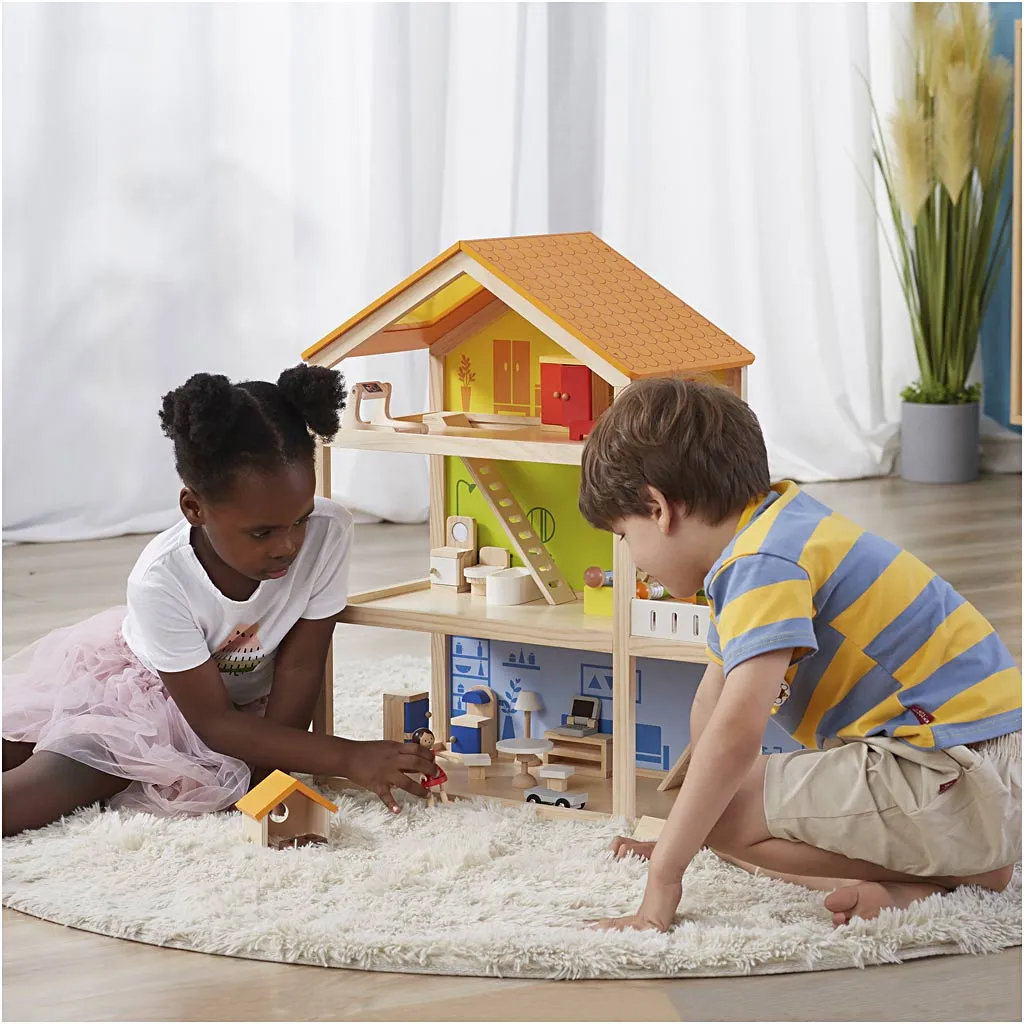 Dockhus i tre våningar med terrass, garage och hundkoja. Öppna huset på båda sidor så att flera barn kan leka samtidigt. Som gjort för fantasifulla rollspel.I det här stora dockhuset bor en söt liten dockfamilj – pappa, mamma och deras två gulliga barn. Barnen kan inreda huset med vackra trämöbler och spela olika rollspel som återspeglar den riktiga vardagen. De kan till exempel natta barnen, gå ut med hunden, köra bil och ta ett bad. Huset är fyllt med roliga aktiviteter som främjar rollspel