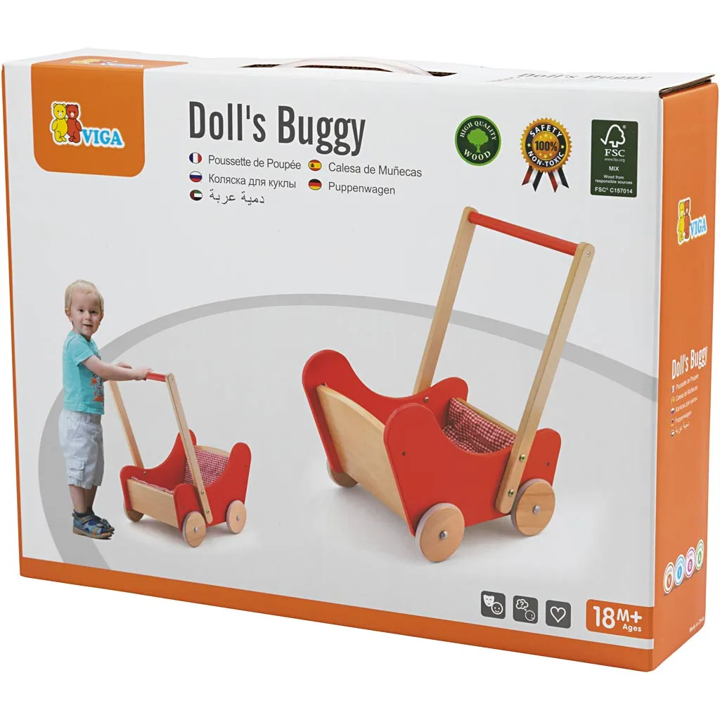 Snygg och robust dockvagn i bok. Med gummiringar på hjulen, så att vagnen är lätt att köra och inte repar golvet. Inkl. kudde i bomull