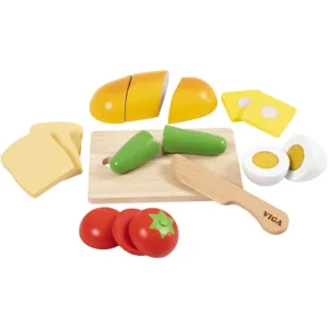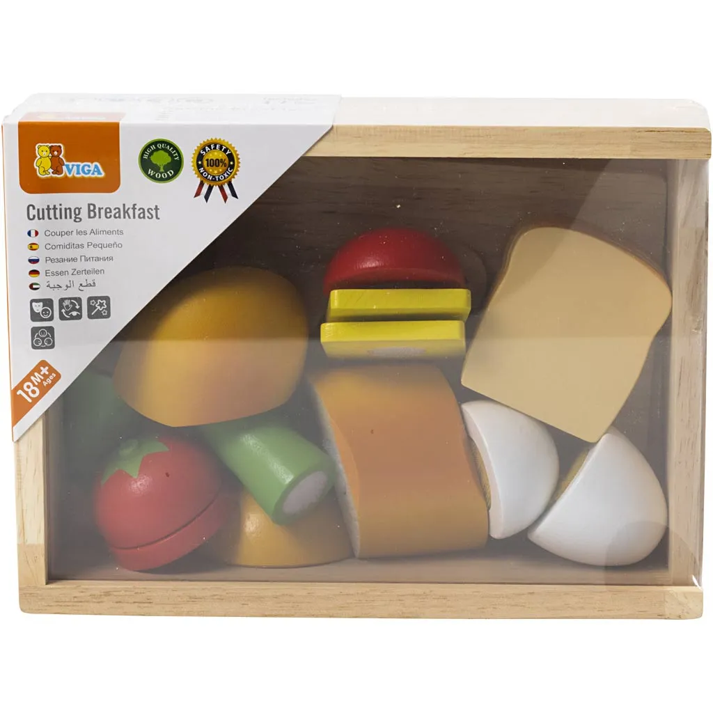 Bekanta livsmedel i trä med kardborrband i mitten gör det enkelt för minikocken att förbereda dagens viktigaste måltid.Nu kan barnet servera frukosten utan risk för vare sig smulor, fläckar eller kladd. Alla livsmedel har kardborrband i mitten så att barnet enkelt kan skära itu och sätta ihop dem igen. Leksakslivsmedlen passar perfekt i leksaksköket. Kanske får nallen eller dockan ett litet smakprov när frukosten är färdig?