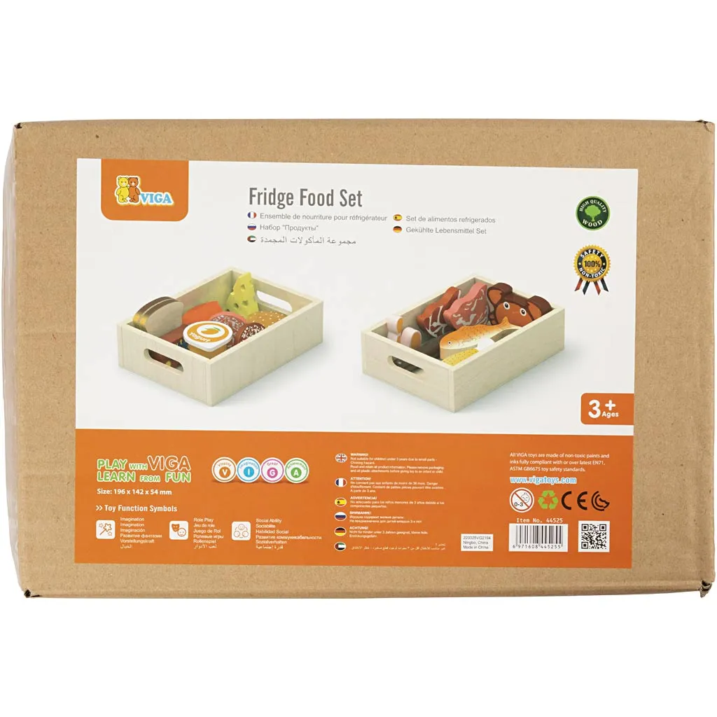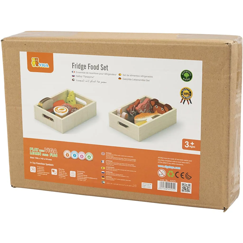 Rolig leksaksmat som barnen känner igen från kylskåpet i hemmet. Perfekt för rollspel i leksaksköket eller leksakslivsmedelsbutiken..Skäm bort din lilla butiksinnehavare eller kock med verklighetstrogen leksaksmat från VIGA. Maten levereras i en snygg trälåda och lämpar sig perfekt för rollspel där barnen imiterar shopping- och matlagningssituationer
